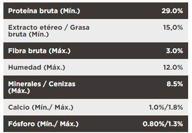 - Alto contenido de proteínas para mantener una masa muscular magra.