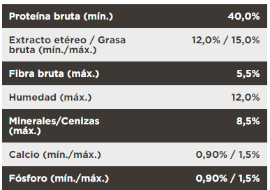 - Altos niveles de proteínas y fibras naturales además de niveles reducidos en grasas, que ayudan a reducir las calorías y a mantener la condición corporal ideal.